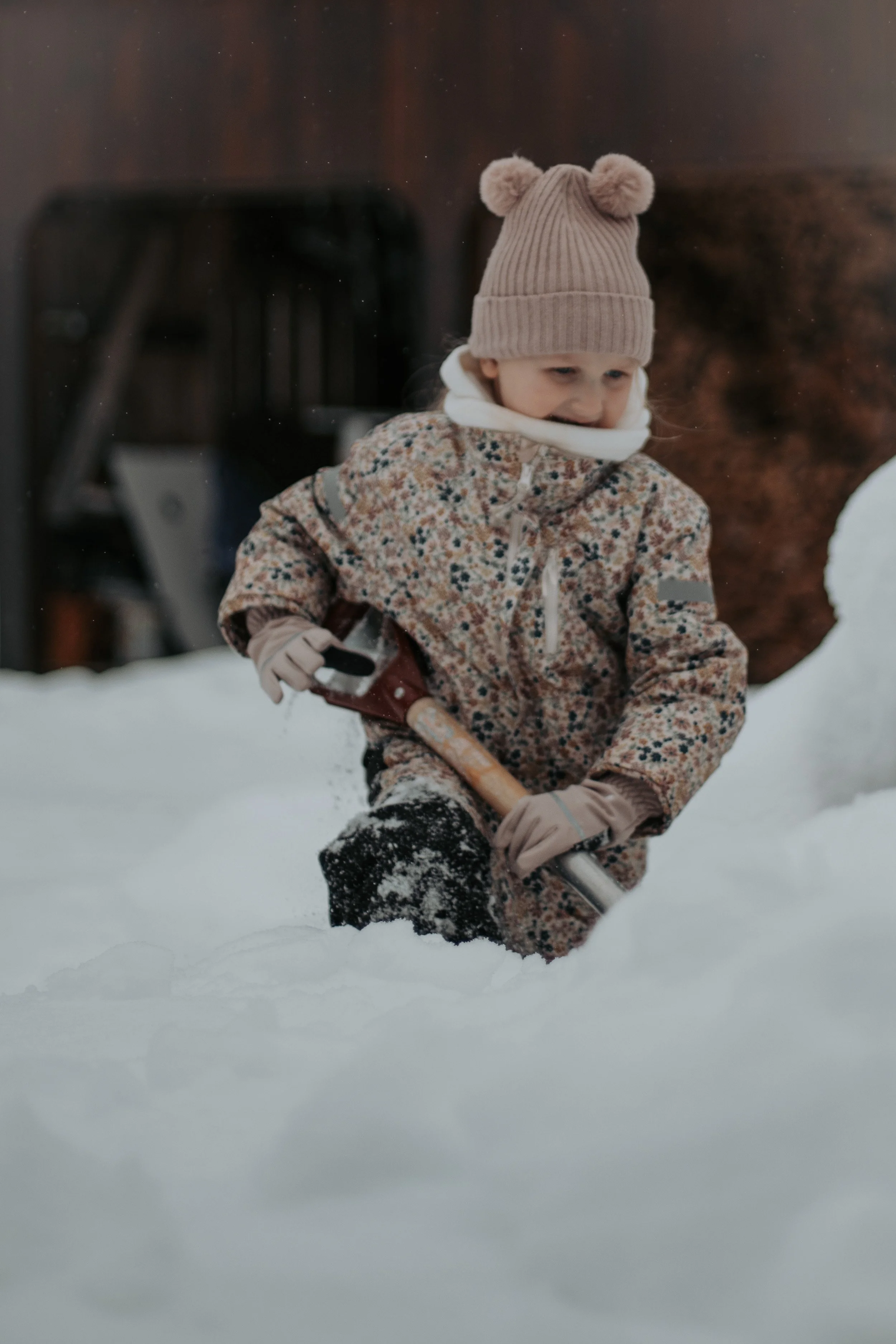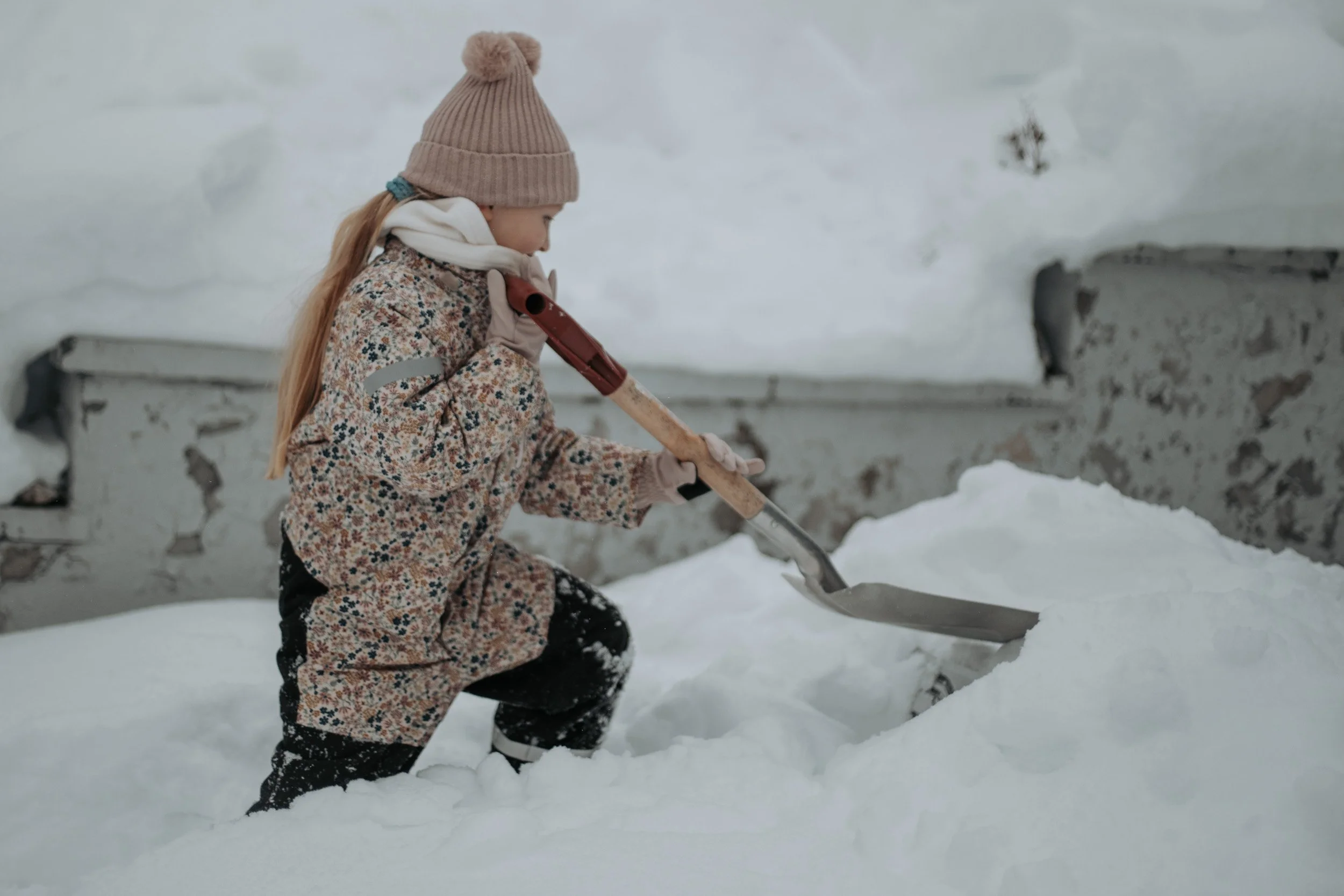 Under dekke av at vi trengte litt hjelp med måking, fikk vi lurt henne med oss ut. Vi satte henne til å spa i den nettopp dannede snøhaugen. Hun skjønte fort at det var noe ekstraordinært med haugen, og utviste god stamina. Hun ble overlykkelig da hun fant ut at det lå en kjelke der -akkurat den hun hadde ønsket seg.